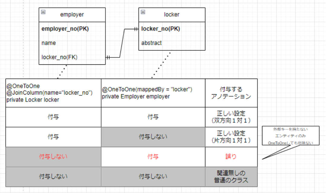 Employerエンティティ - Lockerエンティティ の、片方向1対1の関係を考える。