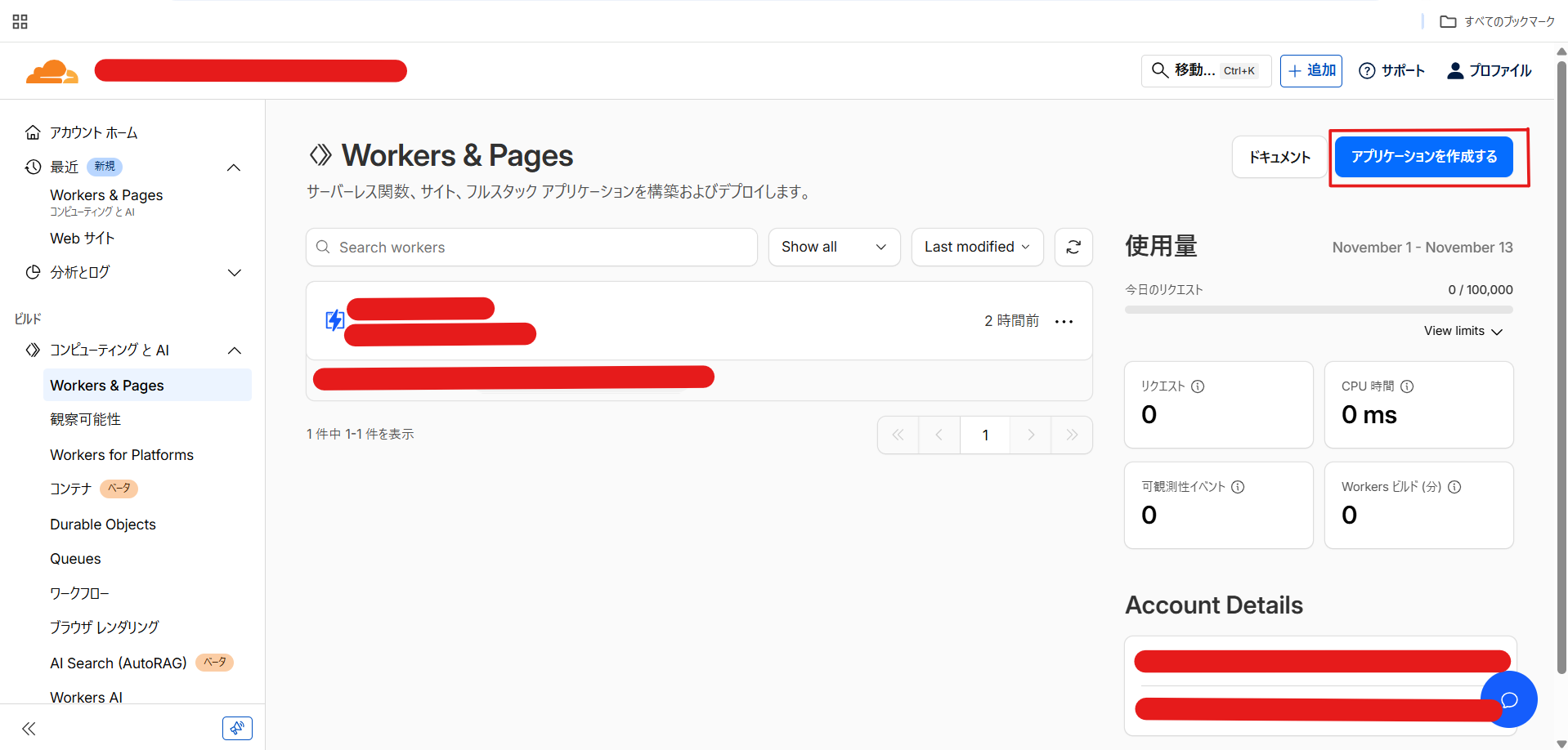 ①:cloudflare にログインし、「Workers&Pages」のタブから、「アプリケーションを作成する」を押下する。