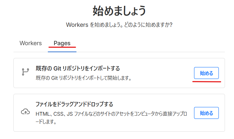 ②:「既存の Git リポジトリをインポートする」の「始める」を押下する。