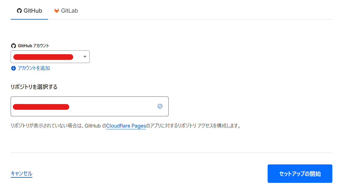 ③:自分のアカウントと、対象のリポジトリを選択し、「セットアップの開始」を押下する。